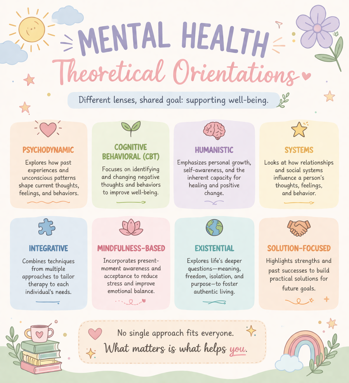 My theoretical orientation reflects a flexible, integrative approach to mental health care, drawing from evidence-based practices while remaining grounded in empathy and authenticity. I value understanding each client through multiple lenses, recognizing how past experiences, present thoughts, and relational dynamics shape well-being. By incorporating approaches such as cognitive-behavioral therapy, motivational interviewing, and mindfulness-based techniques, I tailor interventions to meet each individual’s unique needs. Ultimately, I believe that effective therapy is not one-size-fits-all, but a collaborative process centered on what best supports the client.